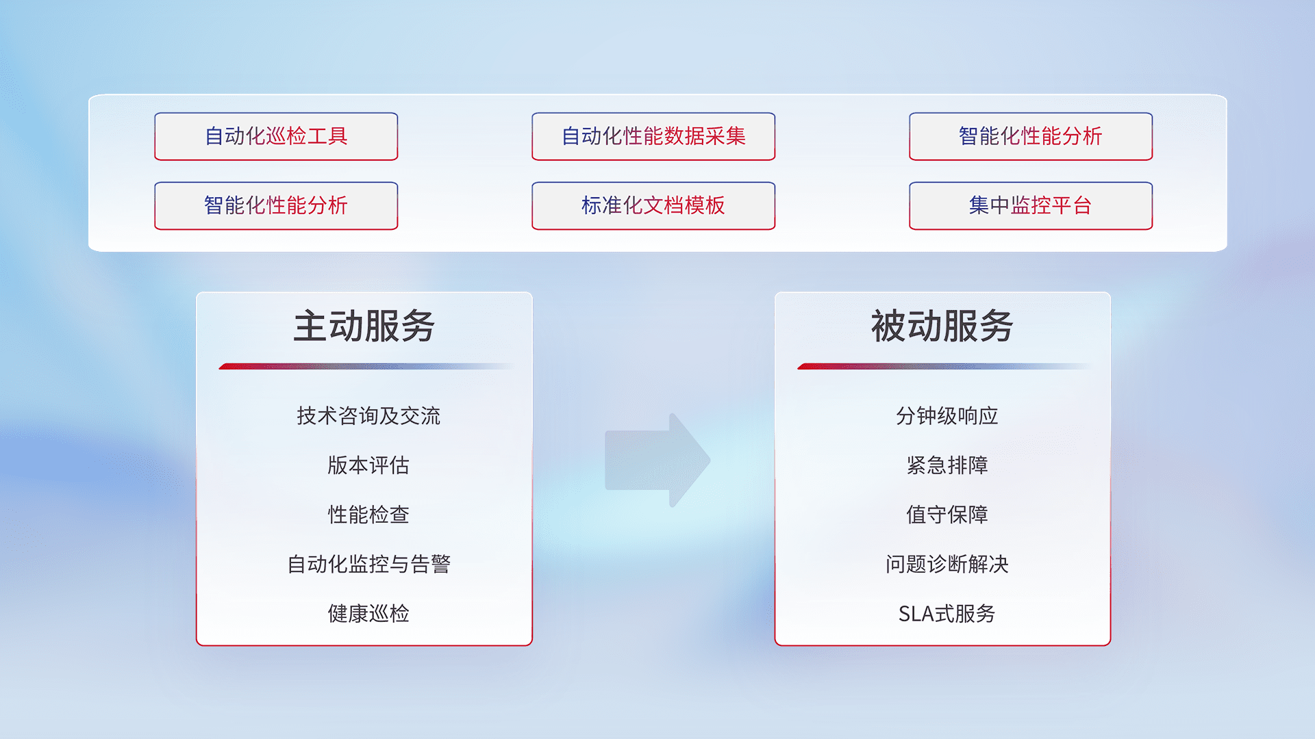 智能化工具和标准化文档,,,保障服务质量,,,提供主动服务(包含技术咨询、、、版本评估、、性能检查、、自动化监控与告警、、健康巡检)和被动服务包含(分钟级响应、、、紧急排障、、、值守保障、、问题诊断解决、、、SLA服务)。。