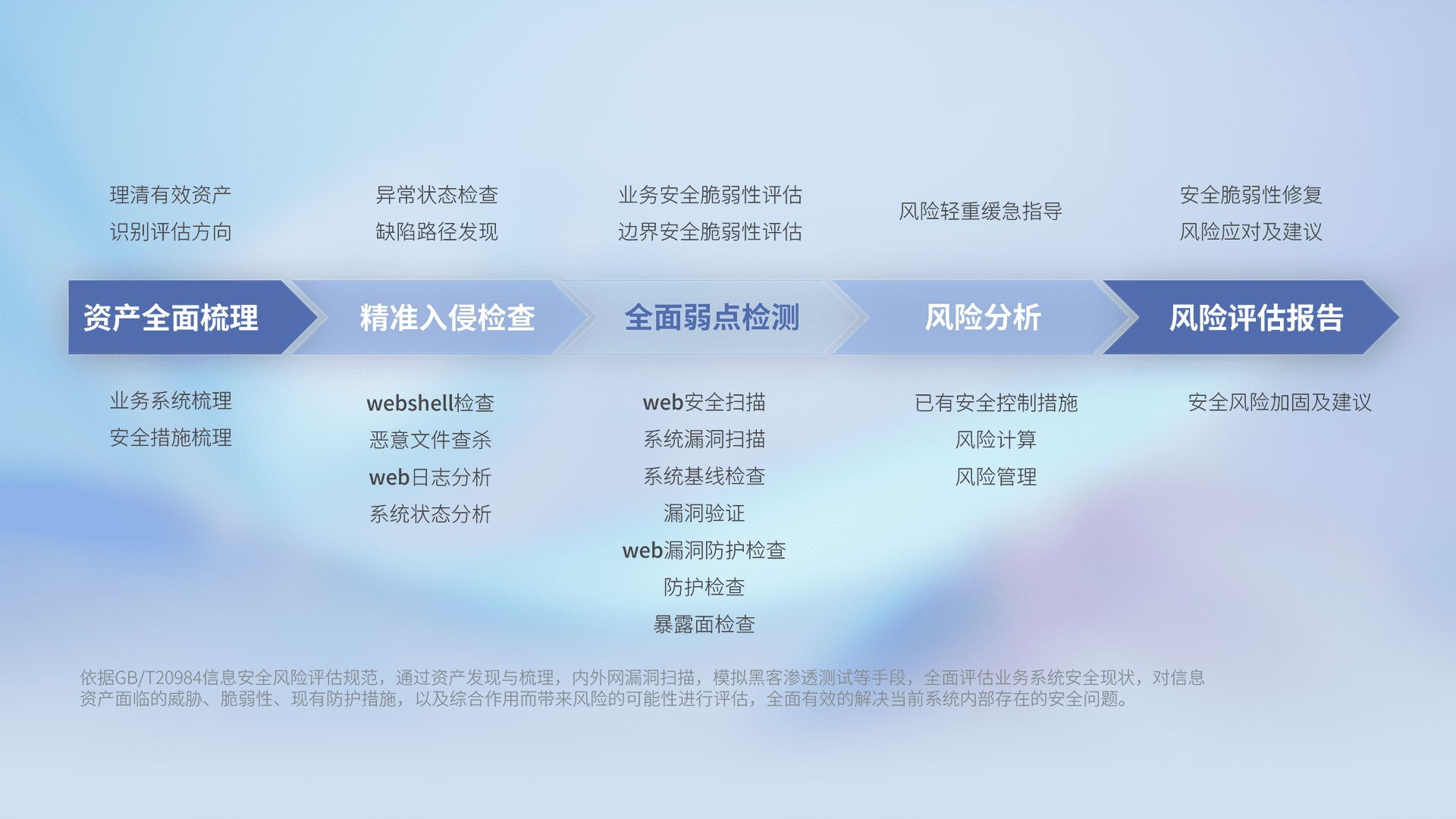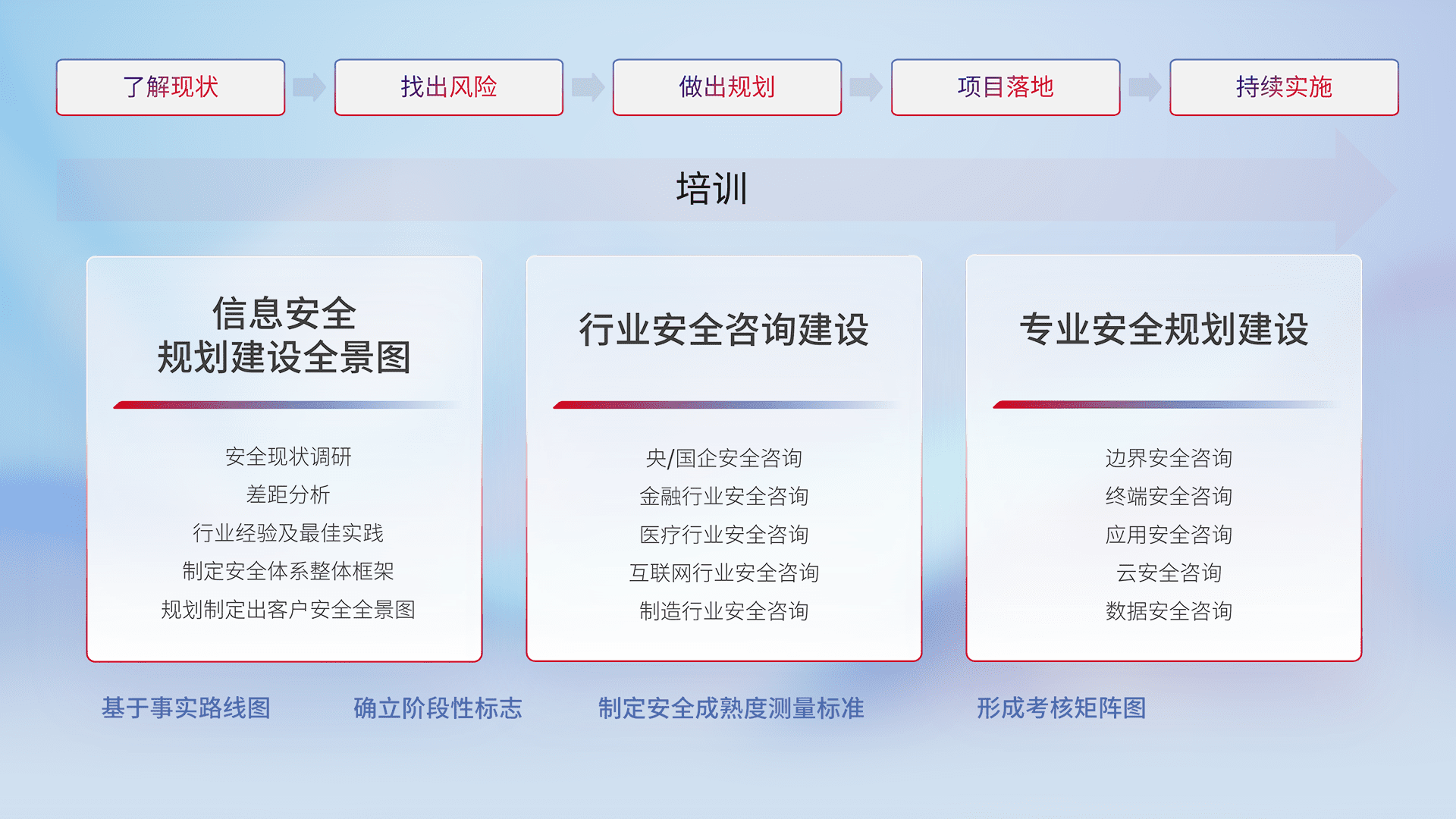针对客户行业特性,,以专业的安全服务+多厂商联合解决方案提供专属的一站式安全管理服务,,帮助客户全面感知网络空间威胁,,基于识别、、、检测、、、、分析、、、、防护、、监测、、响应的服务理论模型,,,从方案咨询、、集成交付、、、评估验证、、、优化加固、、、、运维运营,,致力于为客户提供完整的闭环管理式安全服务。。。以实战经验为客户打造高抵御风险的安全体系,,帮助客户发现威胁、、对抗威胁、、处置威胁,,不断积累安全对抗能力,,,持续保障数字化安全。。。
