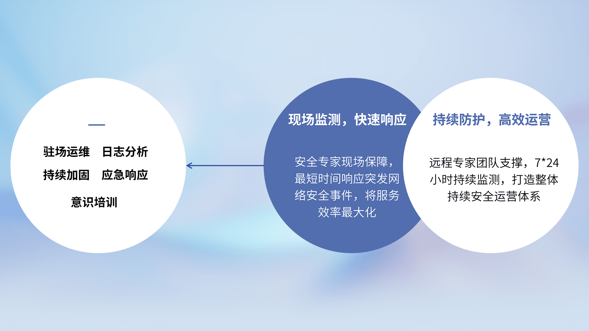 针对客户行业特性,,,,提供专属的一站式安全管理服务,,,帮助客户全面感知网络空间威胁,,通过安全专家的线上、、、线下防护支持,,,实现风险闭环,,,,将安全保障常态化,,,为客户打造常态化安全运维运营服务。。。。